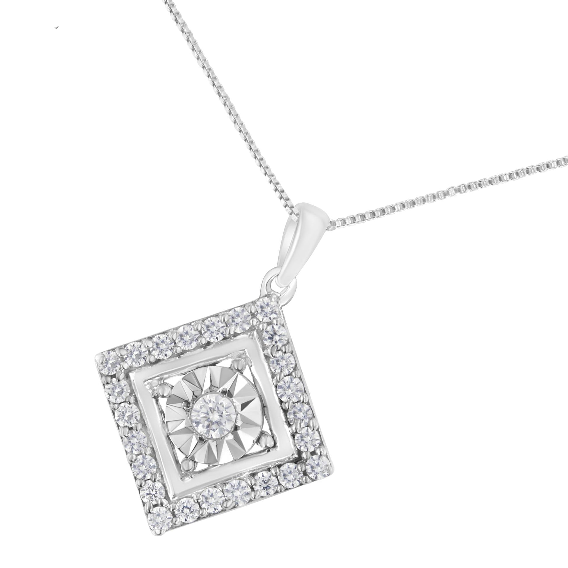 Elegant and unique, this 10k white gold square-shaped pendant will sparkle on your neck. This beautiful necklace features a single, beautiful miracle set, round-cut diamond at the center of the design. The diamond is framed by a layer of white gold, and a layer of 24 stunning round-cut diamonds. This fabulous necklace will become a staple in your everyday wear.